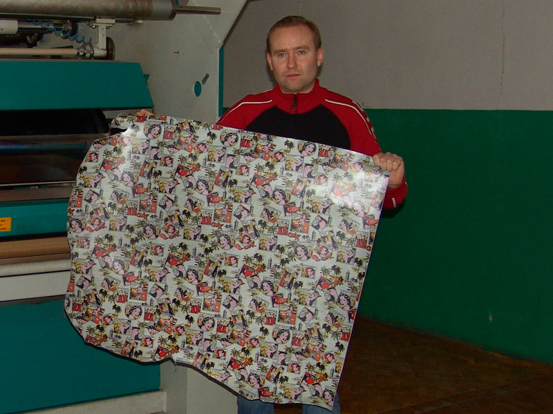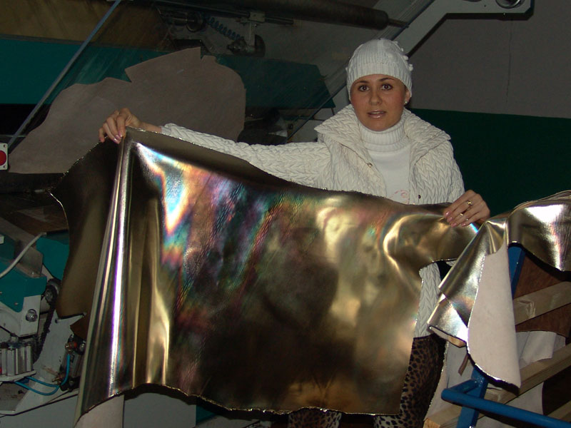 - nowoczesne linie technologiczne do wykańczania skór foliami transferowymi (nadruki kwasowe, folie metaliczne, itp.)